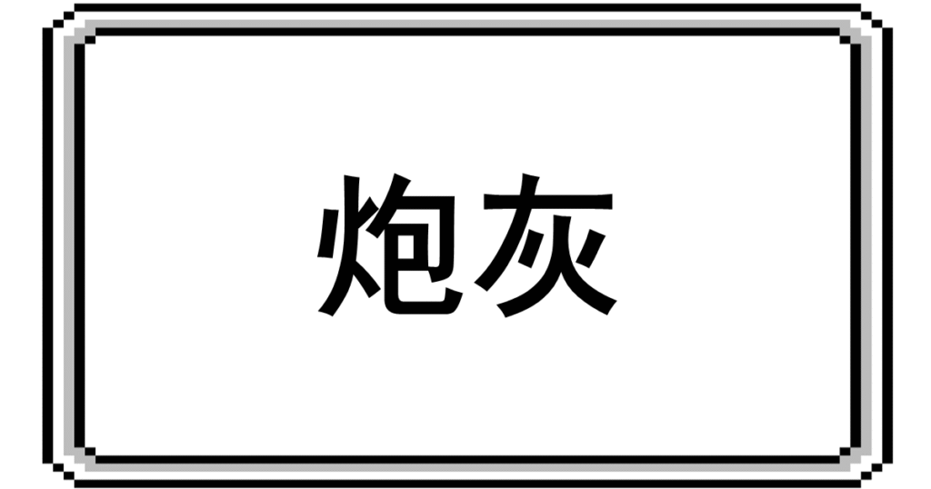 炮灰(pào huī) 意味:捨て駒、弾よけ、犬死に 字面通りに解釈すると「大砲の灰」。捨て駒にされる立場の兵士の目線からなら「犬死に」という訳も可能。 例:在战争中,很多士兵只是被当作炮灰。(戦争では、多くの兵士はただの捨て駒として扱われる) 例... -