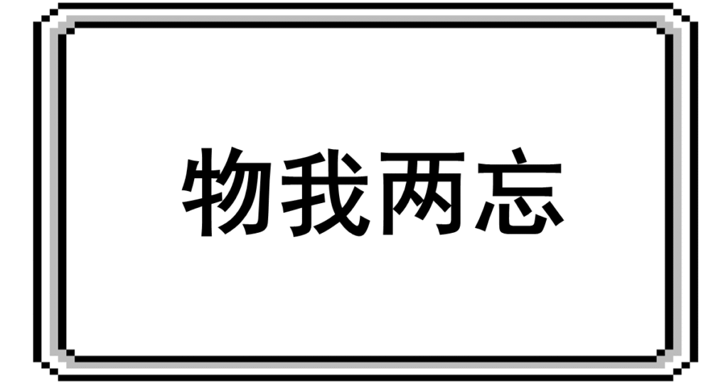 物我两忘(wù wǒ liǎng wàng) 意味:何もかも忘れる デジタル大辞泉によると、物我(もつが)という日本語があり、「外界一切のものと自分」という意味。それを両方忘れるという意味なので、「外界(物)」と「自分(我)」の区別を忘れ、完全に一体とな...
