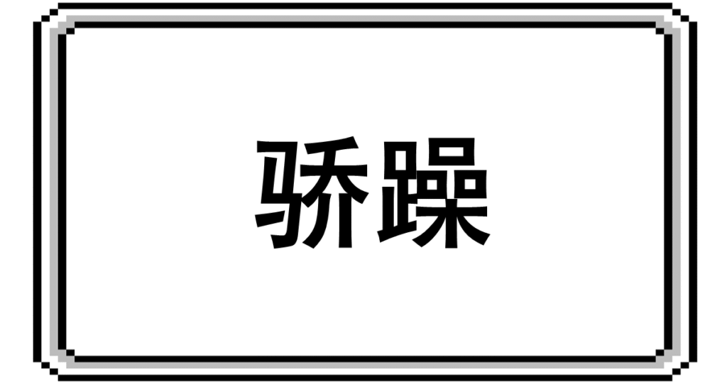 骄躁(jiāo zào) 意味:うぬぼれた、気持ちの浮ついた、自信過剰な 大修館書店の『中日大辞典』によると「傲慢で軽薄である」という意味。この説明だけではちょっとイメージしづらいが、傲慢を表す「骄」に「躁」がプラスされることで軽率に行動すること... -