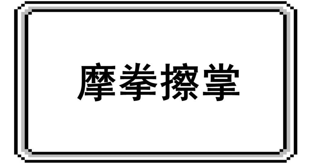 摩拳擦掌(mó quán cā zhǎng) 意味:指をポキポキ鳴らす、準備万端、やる気十分 この動作のこと。チンピラがケンカする前にやるやつ。ケンカの場面ではなく抽象的な言い回しであれば、「やってやるぞ」的な感じで「やる気十分」などになると思う。摩拳(m... -