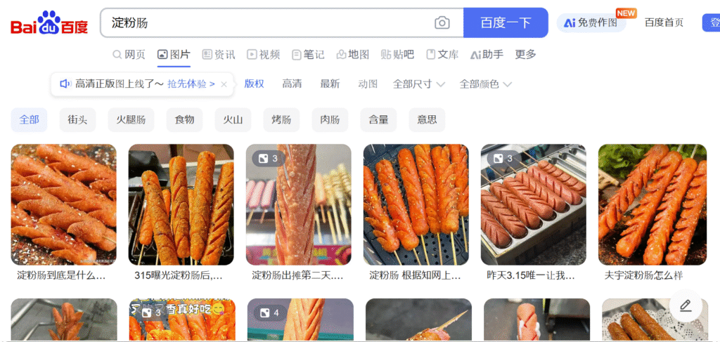 火腿肠(フランクフルト)に似ているが、肉の使用割合がより少なく、でんぷんの割合が多い。
